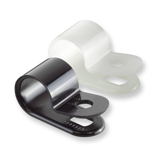 3/16" white nylon cable clamps. 3/8" width, 0.17" mounting hole diameter. An easy and economical way to secure cables. Made entirely from 6/6 nylon, so there's nothing to corrode or rust. Fasteners not included.