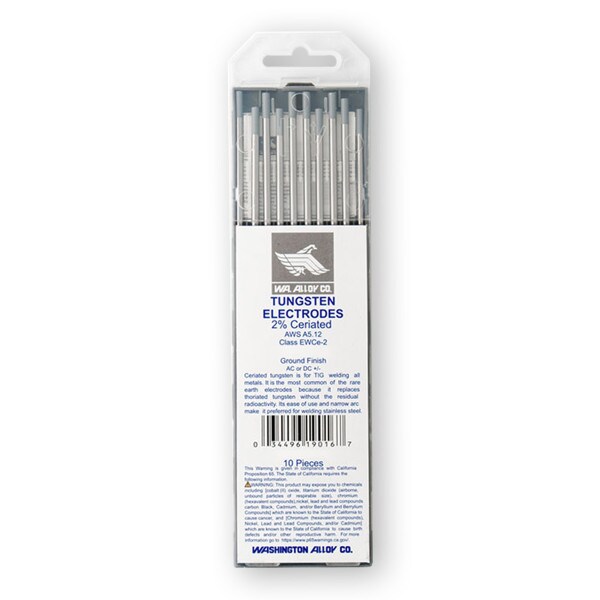 Washington Alloy Tungsten Electrodes, 2% Ceriated (Gray Tip), 0.062" Diameter, 7.000" Long, Set of 10